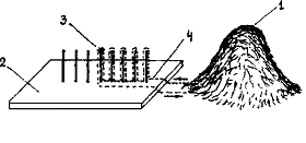 | Рис. 7 | 1 — муравейник; 2 — доска с колышками; 3 — лакомство; 4 — траектория муравья-разведчика. |
