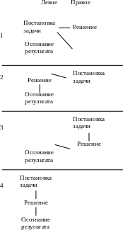 По четвертой схеме постановка задачи, ее решение и осознание осуществляется в левом полушарии. Возникает законный вопрос: существуют ли открытия, развивающиеся целиком слева, и если да, то можно ли их назвать интуитивными. В соответствии с принятым определением ядро интуиции – неосознанность промежуточных результатов. Во время скачка (даже внутриполушарного) те логические операции, которые “перепрыгнуты”, не осознаются и развивающийся по этой схеме процесс может быть отнесен к интуитивному.