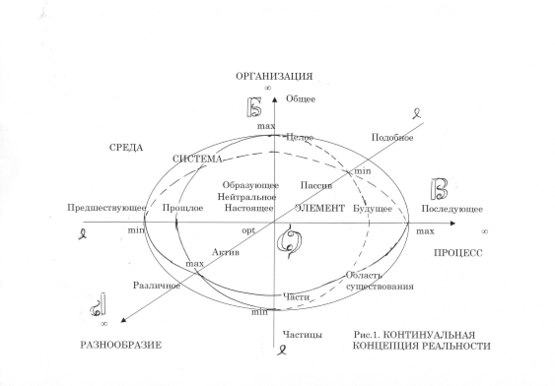 Аксиоматическое построение мировоззрения предполагает отражение основных проявлений Порядка Природы по принципу минимума исходных сущностей, наиболее простых, обще понимаемых уже на уровне интуитивных представлений и отвечающим основным требованиям аксиоматического подхода: непротиворечивость, полнота, независимость, разрешимость входящих аксиом. С учетом вышеизложенного представляется возможным построить систему аксиом теоретики через основные проявления Порядка Природы на основе постулата «Мир есть Изменение Связанных Объектов». Используя эти предельно универсальные представления для однозначного отображения любых реальных явлений в мире, можно наглядно графически отобразить континуальную концепцию реальности в виде 4-ех взаимосвязанных перпендикулярных геометрических составляющих как показано на рис. 1, где наглядно отражены основные понятия языка описания реальности, меры параметрического представления и количественные математические оценки для освещения каждого конкретного явления как системы, состоящей из образующих элементов и функционирующей в окружающей среде, что определятся областью его существования.