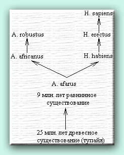 Перший етап являє собою чисто біологічну еволюцію, на другому етапі до біологічного підключається ще і соціальна еволюція, що на третьому етапі стає домінуючою. Зараз можна припустити наступну схему філетичних відносин між предками людини: Загальним предком австралопітеків і роду Homo є A. afarus, кістяк якого був виявлений у Кенії, Ефіопії і Танзанії. Стародавність знахідок датується 4 - 2,8 млн. років. По будівлі кістяка видно, що A. afarus ходив на двох ногах. Об’єм мозку був 380 - 450 см3, що відповідає приблизно обсягу мозку сучасного шимпанзе. A. afarus дав початок роду Homo, а також продовжив гілку австралопітеків, що випливають у який був вид A. africanus (південно-африканськ людиноподібний австралопітек). Він мав прямоходіння, маса мозку була 450-550 гр. при загальній вазі 25-65 кг.