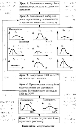 Цей етап імітаційного моделювання для різних реалізацій вхідних випадкових величин повторюється достатню кількість разів, скажімо, 500. Таким чином, на підставі великої кількості результатів імітаційних експериментів утворюється закон імовірнісного розподілу NPV, IRR та інших характеристик, які цікавлять аналітика.