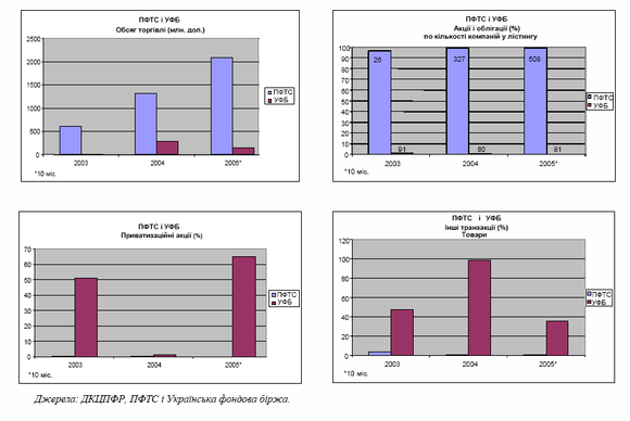Як зазначалося вище, ПФТС є основним організатором торгівлі в Україні, і її частка у загальному обсязі торговельних транзакцій на регульованому ринку у 2005 році становила 86%. На другому місці по активності серед організаторів торгівлі стоїть Українська фондова біржа (УФБ), частка якої в обсязі торговельних транзакцій на регульованому ринку становить приблизно 13%. Для створення основи для надання рекомендацій щодо того, як у найкращий спосіб вирішити проблеми фрагментованого ринку ЦП в Україні, важливо зрозуміти розвиток і поточний стан операцій цих двох основних організаторів торгівлі.