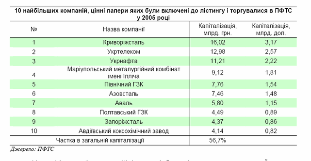 Криворіжсталь і Укртелеком були двома найбільшими компаніями на основі ринкової капіталізації, що становила 3,17 млрд. дол. і 2,57 млрд. дол., відповідно, за рік, що закінчився у грудні 2005 року. Показники діяльності “блакитних фішок” є важливими не лише тому, що вони є найбільшими компаніями, цінні папери яких торгуються, а й тому, що вони є основним компонентом індексу фондового ринку ПФТС, який є найбільш використовуваним індикатором роботи фондового ринку України.