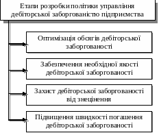 Політика управління дебіторською заборгованістю передбачає чотири етапи її розробки (рис. 1.). Розглянемо суть та інструменти управління, що можуть застосовуватися з кожного етапі розробки політики управління дебіторською заборгованістю торговельного підприємства.