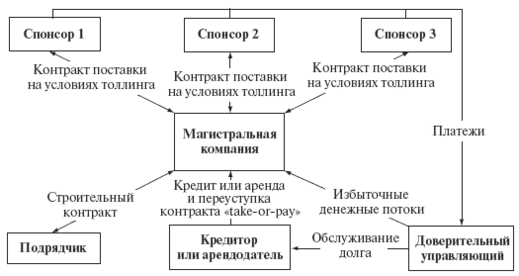 Платежи по контракту «take-or-pay» переводятся доверительному управляющему, который, в свою очередь, осуществляет обслуживание задолженности перед кредитором или арендодателем. Избыточные денежные потоки поступают в пользу проектной компании.
