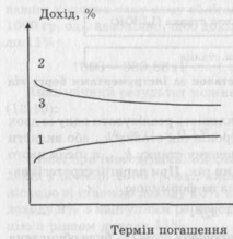Залежність між доходом при погашенні та строком погашення боргового зобов'язання показано на рис. Крива 1 графічно зображує нормальну залежність між терміном погашення зобов'язання та його дохідністю. Чим більший термін обігу боргового зобов'язання, тим більшою є ставка доходу за ним, що відповідає стабільній ситуації на фінансовому ринку. Крива 2 відображує обернену залежність між дохідністю та терміном обігу активу, при якій короткострокові фінансові активи мають вищу дохідність, ніж довгострокові. Така залежність може спостерігатись у періоди кризових явищ в економіці. Горизонтальна пряма 3 означає незалежність процентних ставок від термінів погашення боргових зобов'язань і трапляється досить рідко в періоди невизначеності в економіці.