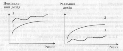 Оскільки при розрахунку процентних ставок за державними цінними паперами використовуються очікувані чи прогнозовані рівні інфляції, на час виплати процентів такі папери можуть мати реальну дохідність, яка дорівнює нулю, або приносити збитки. Схематично залежність рівня доходу за різними фінансовими активами від ступеня їх ризиковості показано на рис. Крива 1 відображає дохідність фінансових активів, які перебувають у обігу на фінансових ринках, що знаходяться в стадії формування, а крива 2 — на розвинених фінансових ринках.