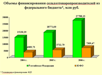 Так, роль Южного федерального округа в продовольственном обеспечении страны достаточно велика: здесь производится около 22% объема сельскохозяйственной продукции России; расположен каждый пятый гектар российской пашни; сельское население составляет четверть (25,3%) от всего сельского населения страны. Говоря о федеральной бюджетной поддержке сельского хозяйства регионов, входящих в ЮФО, следует отметить, что в 2006 году было предусмотрено финансирование с темпом роста 28 процентов. При этом, если доля округа в объемах Российской Федерации составляет около 22%, то финансовая поддержка составляет от российских показателей 26%, а в физическом выражении это 7,3 млрд. руб. (рис. 1).