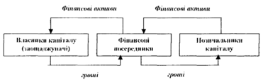 Передача капіталу від заощаджувачів до позичальників може відбуватися за двома схемами, а саме шляхом прямого і опосередкованого фінансування. Пряме фінансування забезпечується без участі фінансових посередників, і полягає у переміщенні заощаджень безпосередньою від власників заощаджень до позичальників шляхом розміщення фінансових активів позичальників на ринку (рис.1). Проте це її механізм в більшості випадків характеризується низькою ефективністю, що пов'язана зі значними витратами позичальників на пошук інвесторів, тривалим терміном розміщення на ринку випущених фінансових активів та недооцінкою їх вартості, впливом фінансових ризиків тощо.