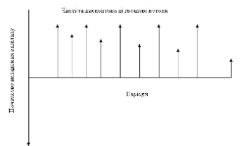 Як видно з рисунку 7, для інвестора початкові інвестиції мають знак "-", грошові потоки – знак "+". Якщо NPV>0, сума довжини відрізків дисконтованих грошових потоків повинна перевищувати довжину відрізка початкового вкладення капіталу. Коли ж NPV<0, ситуація буде зворотною, а; при NPV=0 довжина цих відрізків повинна збігатися.