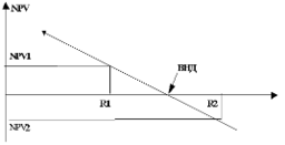 Норму рентабельності інвестицій можна також визначити за допомогою графічного методу. Для цього по осі абсцис відкладають значення NPV, а по осі ординат — значення коефіцієнта дисконтування (рис. 1).