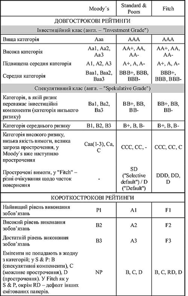 На теперішній час у світі існує ціла низка рейтингових агентств, проте найбільшою популярністю користуються рейтинги, обчислені всесвітньо відомими фірмами Мудиз (Moody's Investors Service, Moody's), Стандард енд Пурз (Standard & Poor's Corporation, S & P) і Фіч Інвесторз (Fitch Investors Service) (табл. 1).