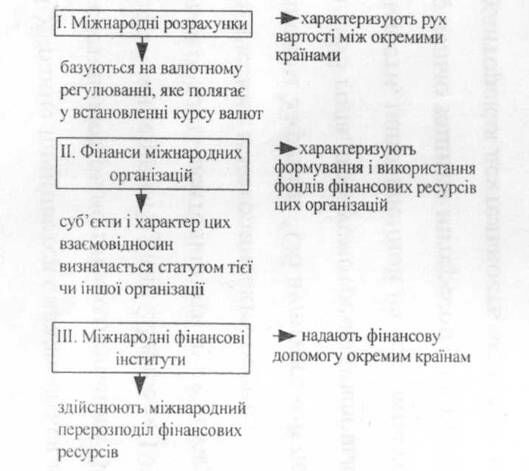 Сфера міжнародних фінансів відображає перерозподільчі відносини та централізацію ресурсів на світовому рівні. Вона складається з двох частин — міжнародних фінансових відносин, та безпосередньо міжнародних фінансів.