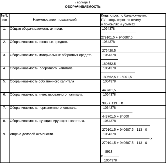 Коэффициенты оборачиваемости имеют большое значение для оценки финансового состояния предприятия, поскольку скорость оборота капитала, то есть скорость превращения его в денежную форму, оказывает непосредственное влияние на платежеспособность предприятия. Кроме того, увеличение скорости оборота капитала отражает при прочих равных условиях повышение производственно-технического потенциала предприятия. Для этого рассчитываются 8 показателей оборачиваемости и один комплексный показатель - "индекс деловой активности", дающие наиболее обобщенное представление о хозяйственной активности п