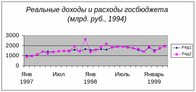 На рис. 3 показаны реальные доходы и расходы государственного бюджета, скорректированные на уровень инфляции.Рис.31