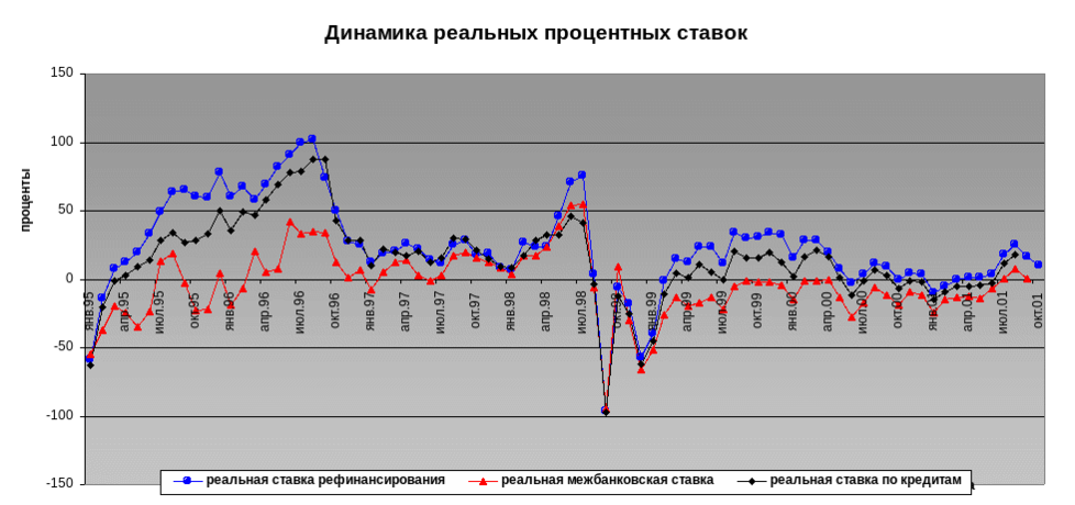 В 1995-1996 годах реальный процент стал не только плюсовым, но и довольно высоким, что постепенно отключало реальную экономику от пользования банковским кредитованием. Этому периоду соответствует положение спада ВВП и промышленного производства не только из-за недостаточного агрегатного спроса, но так же из-за чрезмерной дороговизны кредита. Такая реально жесткая денежно-кредитная политика действительно способствовала снижению инфляции, но при этом убивала реальную экономику и порождала ряд отрицательных явлений в финансовой сфере – нарушение нормального платежного оборота между предприятиями, переход на бартер и коммерческие векселя, а также укрытие денежных доходов от налогового ведомства.