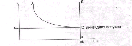 Если предложение денег увеличивается, то норма ссудного процента снижается, кредит охотно берут предприниматели, инвестируют его в производство, и темпы развития экономики повышаются. Таким образом, государство может преднамеренно нарушать равновесие на рынке денег с целью ускорения развития экономики. Однако процентная ставка не может снижаться бесконечно, есть минимальная норма, ниже которой она не может снизиться. Эта минимальная норма определяется издержками банка. Точка касания кривой спроса и кривой минимальной нормы ссудного процента получила название ликвидной ловушки (рис. 5).