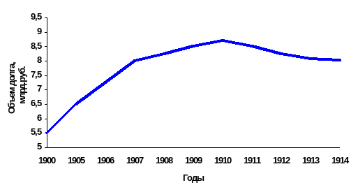 Кредитная история России началась в 1769 г., когда Екатерина II сделала первый заем в Голландии. За последующие два с половиной столетия Российская империя заняла на рынке примерно 15 млрд. руб. Большая часть этих средств накануне революции была погашена. К этому моменту старейшими займами в составе русского государственного долга оставались 6%-ные займы 1817-18 гг. Их нарицательный капитал составлял 93 млн. руб., а непогашенная часть к 1 января 1913г. равнялась 38 млн. руб. На графике отражена динамика государственного долга Российской империи в начале XX в.: сумма задолженности возросла в период русско-японской войны и революции, а затем стабилизировалась.