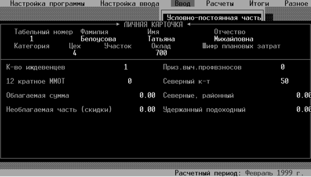 Все данные о работниках заносятся в условно постоянную часть, по сути дела этот пункт представляет собой личную карточку сотрудника, в которой находятся наиболее статические данные. При выборе данного пункта меню программа запрашивает табельный номер работника. Если данного табельного номера нет в базе данных, программа произведет запрос на ввод нового табельного номера. Карточка разделена на две части горизонтальной линией. В верхней части находится постоянная часть, которая не может быть изменена пользователем, а в нижней выводятся поля базы исходных данных. (см. рис 5)