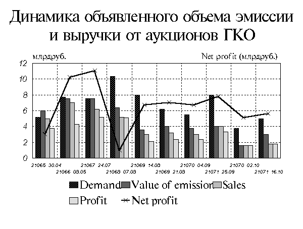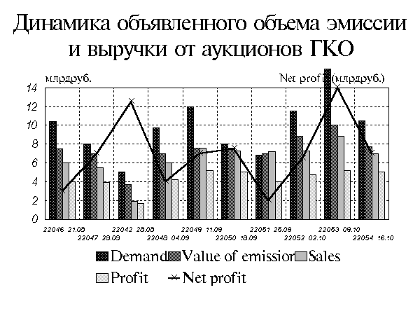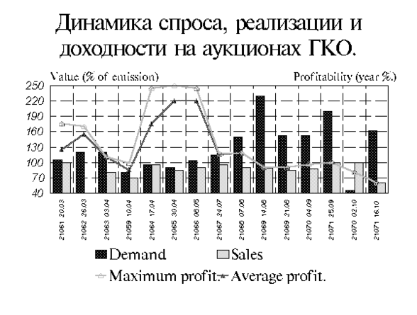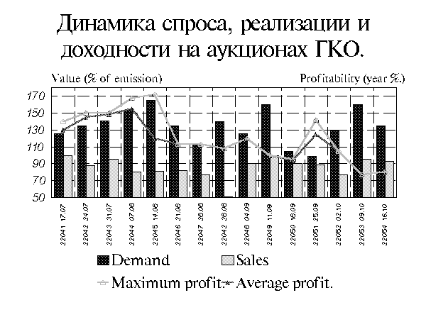 На рынке ГКО в последнее время наблюдалось медленное, но достаточно стабильное снижение средневзвешенной доходности. Хотя Минфин не прилагает особенных усилий для подавления доходности ГКО, дилеры рынка и их клиенты вынуждены были смириться с планомерной политикой эмитента по установлению аукционной доходности новых выпусков на уровне текущей доходности рынка. Однако рынок ГКО на фоне падения доходности на дру-гих секторах рынка и прежде всего с отсутствием у банков свободных ресурсов для спекуляций на внебиржевом валютном рынке остался самым привлекательным сектором финансового рын- Рынок ГКО благодаря своей высокой ликвидности и надёжности является одним из са-мых развитых секторов российского финансового рынка. Увеличение активности дилеров, равно как и накопленный ЦБ , Минфином и дилерами опыт, а также достаточно усовершен-ствованная компьютерная технология торгов на ММВБ позволяют сказать, что на рынке государственных ценных бумаг государственные краткосрочные облигации являются одним из лидирующих инструментов и по показателям ликвидности и надёжности, и по размерам эмиссии, и по количеству участников.