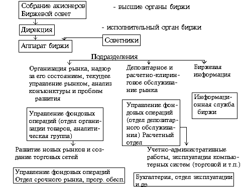 Организационную структуру российской фондовой биржи рассмотрим на примере ММВБ. ММВБ - акционерное общество закрытого типа. Рассмотрим оргструктуру, относящу-юся к операциям с ценными бумагами.