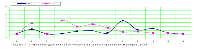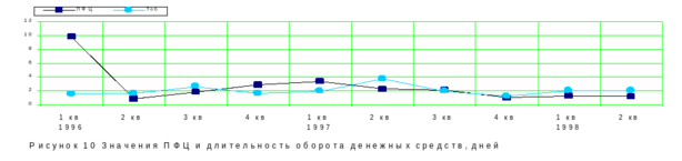 С 4 квартала 1997г. наметилась тенденция к сокращению продолжительности финансового цикла. Это хорошая тенденция, так как чем меньше ПФЦ, тем быстрее денежные средства обращаются и приносят дополнительную прибыль в процессе реализации продукции и других поступлений денежных средств. Аналогичную тенденцию имеет и показатель длительности оборота денежных средств (см. рис. 11).
