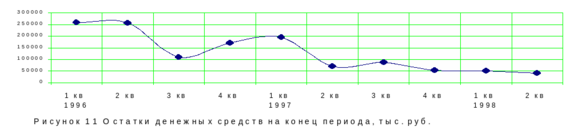 зменение остатков денежных средств на конец кварталов носит непрямолинейный характер. Такая тенденция похожа на синусоидальный закон изменения. Однако, характерна общая тенденция к уменьшению абсолютных значений остатков денежных средств. В 1997г. и начале 1998г. тенденция к снижению приобретает все более отчетливый характер. В свою очередь, такое положение дел влияет на значения коэффициента абсолютной ликвидности, значения которого к концу 1997г. и по прогнозу в 1-2 кварталах 1998г. снижаются. Это может негативно сказаться на состоянии ликвидности организации. К тому же, к концу 1997г. возросло значение кредиторской задолженности. Поэтому необходимо следить за состоянием кредиторской задолженности и размером денежных средств. -