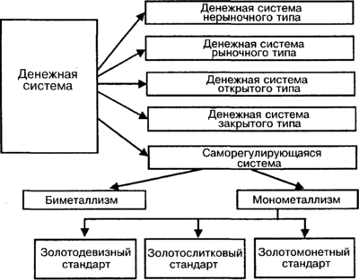 История свидетельствует о существовании таких разновидностей денежных систем как биметаллизм, базирующийся на использовании в качестве денег двух металлов — золота и серебра (XVI - XIX века), и монометаллизм, использующий в обращении лишь один металл — золото, а бумажные деньги свободно обмениваются на этот металл.