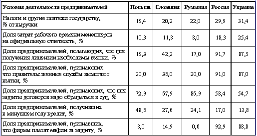Согласно социологическим опросам, в “грабеже” российских предпринимателей первоочередную роль играют государственные чиновники. Взимая довольно высокие налоги (порядка 30 % от выручки), они не обеспечивают взамен предпринимателям сколько-нибудь эффективной поддержкой. Регистрационные процедуры довольно длительны. Предприниматели реже, чем хотели бы, обращаются в суды для разрешения конфликтов, поскольку судебные процедуры длительны и дорогостоящи, а решения судов не всегда предсказуемы и не имеют обязательной силы. Государственные службы буквально терроризируют бизнесменов (особенно, мелких) требованиями мелочной отчетности (на нее уходит почти 20 % рабочего времени руководителей фирм) и частыми инспекциями (в мелких магазинчиках Москвы, по данным опроса 1996 г., — в среднем полтора раза в месяц), участники которых считают своим святым долгом наложить штраф. Кредитная поддержка бизнеса находится в жалком состоянии. В такой ситуации даже честные чиновники (те, кто не берут взяток) воспринимались бы бизнесменами как грабители: уплатив государству налоги, предприниматель получает взамен не просто полное равнодушие к своим потребностям, а еще и лишние заботы. Такие налоги заставляют вспомнить “поминки”, которыми Российское государство в XVI—XVIII вв. откупалось от слишком ожесточенных набегов крымских татар (по принципу “заплатишь — будешь иметь беду, не заплатишь — будешь иметь еще большую беду”).