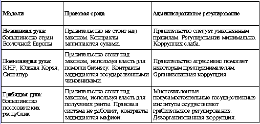 В принципе, даже то, что Т. Фрей и А. Шляйфер называют моделью “невидимой руки”, отнюдь не тождественно полному невмешательству государства в дела бизнеса. Просто в данном случае государство выступает в роли не “доброго деспота”, как в модели “поддерживающей руки”, а стража порядка, который вырабатывает единые для всех эффективные “правила игры” и следит за их выполнением — защищает права собственности, что есть первейшая функция государства в рыночном хозяйстве. Но и эта модель является своего рода идеальным типом, реальная же ситуация в различных странах с модернизируемой экономикой представляют собой, как правило, “смешение всех трех типов”.