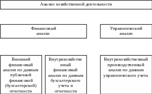 Разделение анализа на финансовый и управленческий обусловлено сложившимся на практике разделением системы бухгалтерского учета в масштабе предприятия на финансовый учет и управленческий учет. Такое разделение анализа несколько условно, потому что внутренний анализ может рассматриваться как продолжение внешнего анализа и наоборот. В интересах дела оба вида анализа подпитывают друг друга информацией.
