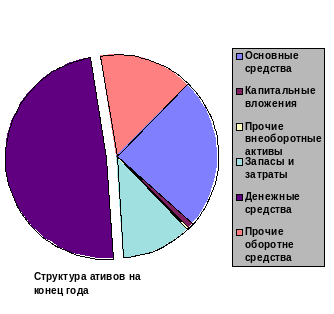Из общей стоимости средств, находящихся в распоряжении предприятия, 24.2% составляют основные средства, которые возросли на конец периода на 31375 млн.крб., или на 13,6%. На 36.6% увеличилась также стоимость оборотных средств, в том числе производственные запасы. Значительно увеличилась доля денежных средст