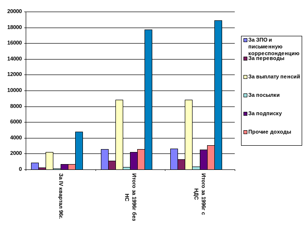 Таблица показывает, что основным видом доходов является доставка и выплата пенсий, доход от выплаты пенсий не облагается налогом на добавленную стоимость. Высокую долю занимает доход от оказания услуг КРПС “Крымтелеком” по приёму платежей от населения за пользование телефоном (рис.3.10.).