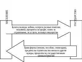 Поток финансовых средств от государства, то есть из государственных источников, поступающих населению, составляют преимущественным образом пенсии по возрасту и инвалидности, пособия, стипендии, выплаты в виде льгот. Обратный финансовый поток в виде налоговых платежей и форм кредитования государства населением движется в направлении от населения к государству. Кредитование государства населением осуществляется в виде вкладов в сберегательные банки, приобретения государственных ценных бумаг.