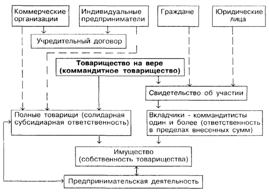 Следующая организационно-правовая форма хозяйствования -товарищество на вере или коммандитное товарищество создается также на основании договора между индивидуальными предпринимателями и/или коммерческими организациями. В него могут входить один или несколько участников, занимающихся от имени товарищества предпринимательской деятельностью и несущих ответственность по обязательствам всем своим имуществом, являющихся полными товарищами, а также участники, которые несут ответственность в пределах сумм, внесенных ими вкладов, являющиеся коммандитистами или вкладчиками. Вкладчиками могут быть любые юридические или физические лица .