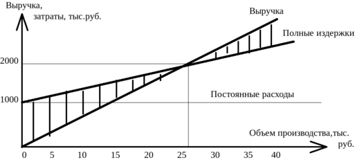 Одним из основных практических результатов использования классификации расходов предприятия по принципу зависимости от объема производства является возможность прогнозирования прибыли, исходя из предполагаемого состояния расходов, а также определение для каждой конкретной ситуации объема реализации, обеспечивающего безубыточную деятельность. Величину выручки от реализации, при которой предприятие будет в состоянии покрыть свои расходы без получения прибыли, принято называть критическим объемом производства ("мертвой точкой"). Для его определения может использоваться следующая формула:
