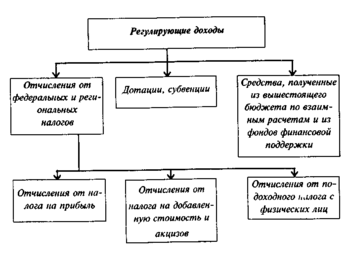 К регулирующим доходам относится вся совокупность денежных средств, передаваемых из вышестоящих бюджетов в нижестоящие с целью регулирования (сбалансирования) их расходов и доходов. Это все финансовые ресурсы, используемые для этих целей, т. е. процентные отчисления от федеральных и региональных налогов, дотации, субвенции, средства, полученные из вышестоящих бюджетов по взаимным расчетам, средства, полученные из федерального и региональных фондов финансовой поддержки территорий. Таким образом, это средства, переданные вышестоящим органом власти нижестоящему на основании юридического акта (закона), постановления, - решения, распоряжения. Передача средств производится либо заблаговременно, т. е. до начала планируемого года на основании плана регулирования и законодательного акта о бюджете на планируемый год, либо в процессе исполнения бюджета по указанию вышестоящих распорядительных и исполнительных органов.
