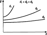 Рост учетной ставки, естественно, оказывает положительное влияние на g, С увеличением п величина g также растет. На рис. 4 показана зависимость g от указанных двух факторов. Заметим также, что максимальное значение п равно 1/d. Тогда g становится бесконечным.