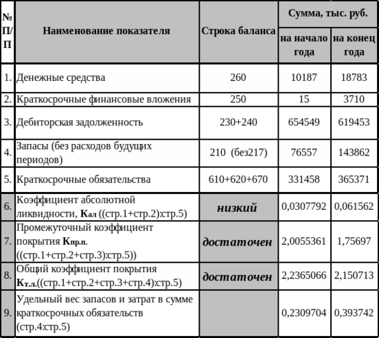 Расчет показателей ликвидности анализируемого предприятия представим в виде электронной таблицы 8.