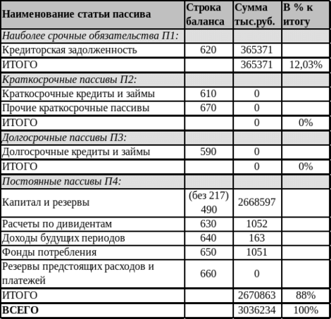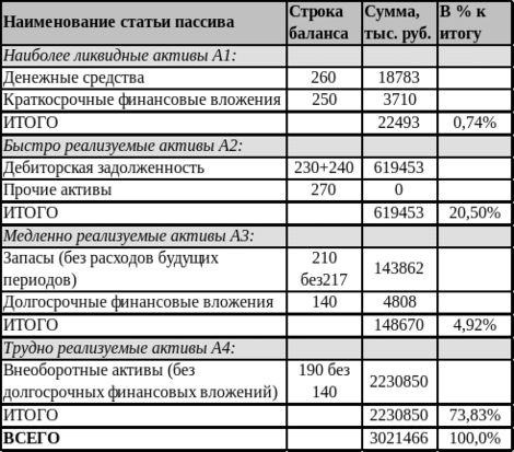 Группировку активов анализируемого предприятия по классам ликвидности целесообразно представить в форме таблицы 6, а группировку пассивов по степени срочности оплаты - в форме таблицы 7.