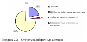 В структуре оборотных средств (рисунок 2) наибольшая доля принадлежит дебиторской задолженности (75%), это объясняется тем, что высокий уровень деловой активности – чем больше объем продаж, тем обычно больше объем дебиторской задолженности.