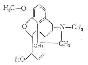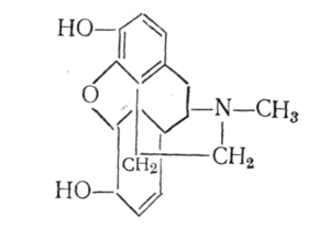 Морфин, алкалоид опийного мака. Обладает сильным болеутоляющим, выраженным снотворным и эйфорическим действием. Тормозит условные рефлексы и усиливает действие наркотических снотворных и местноанастизирующих средств. Возбуждает рвотный центр и понижает возбудимость дыхательного и кашлевого центров, тормозит двигательную и секреторную активность желудочно-кишечного тракта. Понижает основной обмен. Гидрохлорид морфина используют в медицине как обезболивающее средство. Длительное применение приводит к наркомании (морфинизму).[3]