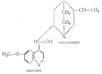Хинин представляет белые кристаллы, в безводном состоянии плавящиеся при 175°, а из воды выделяющиеся с 3 молекулами кристаллизационной воды. Соли его очень горьки на вкус и обладают в растворе прекрасной синей флуоресценцией. Хинин- важнейшее средство против малярии и вообще жаропонижающее; применяется обыкновенно в виде средней сернокислой или хлористоводородной (с одной молекулой НСL) соли.