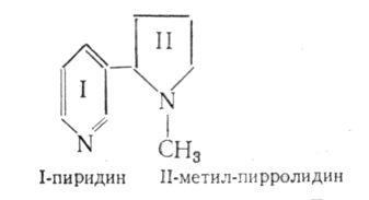 Никотин, алкалоид, содержащийся в табаке (до 8%), а также в растениях некоторых других родов; производные пиридина. При курении табака никотин возгоняется, проникает в дыхательные пути и, всасываясь, действуют на ганглии вегетативной нервной системы и на т. н. холинреактивные структуры центральной и периферической нервной системой. В малых дозах никотин действует возбуждающе на нервную систему, в больших вызывает ее паралич. Никотин это один из самых ядовитых алкалоидов: несколько капель (100-200 мг, т.е. количество, содержащееся в 200 г табака) при в ведении в человека вызывают смерть[3], а ПДК никотина в воздухе составляет 0,5 мг/м3 [5].