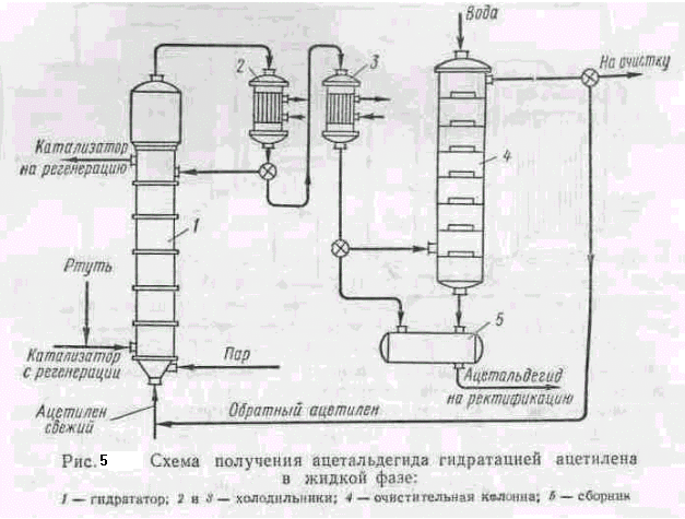 Газы, содержащие ацетилен, поступают в колонну 4, орошаемую водой, где из них извлекаются остатки ацетальдегида, и снова возвращаются в процесс. Для очистки оборотного газа от окислов углерода и азота часть его (10%) непрерывно отбирается из цикла и направляется на очистку. Выход ацетальдегида составляет примерно 96% от теоретического. Так как пары ртути и ее соединения ядовиты, начинают применяться не ртутные катализаторы в виде окислов Zn, Mg, Ni, Со, Cr.