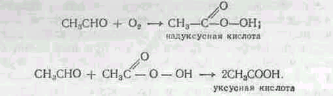 Окисление ацетальдегида кислородом воздуха происходит в присутствии солей марганца при темпеатуре 60—70° С. Так как надуксусная кислота может взрываться, то парогазовая смесь разбавляется азотом. Образование СНзСООН идет по следующей схеме: