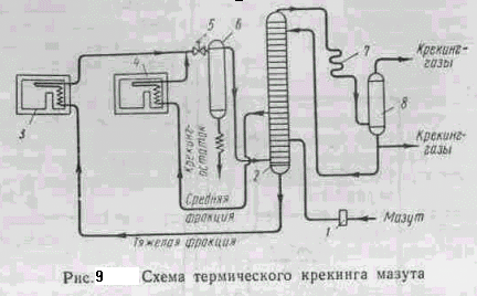 Термический крекинг в смешанной фазе (жидкой и паровой) проводят под давлением до 70 am при температуре 350—500° С. На рис.9 показана схема крекинга мазута. Мазут насосом 1 подается на одну из нижних тарелок ректификационной колонны 2, где смешивается с тяжелой фракцией. Затем смесь подается в трубчатую печь 3, где нагревается до температуры 470—480° С. Из средней части колонны 2 выводится более легкокипящая фракция, которая нагревается в трубчатой печи 4 до 500—510°. Давление в печах поддерживается 50—70 am (5—7 Мн/м2). Продукты крекинга из печей 3 и 4 проходят редукционный вентиль 5 и поступают в испаритель 6, где происходит отделение паров от крекинг остатка, который выводится из испарителя. Пары из испарителя направляются в ректификационную колонну на разделение. Пары бензина и газы проходят конденсатор 7 и сепаратор 8, где они разделяются.