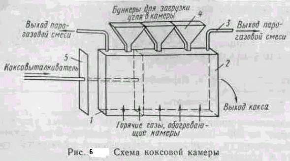 а рис. 6 показана схема коксовой камеры. Она имеет две торцовые стороны — коксовую, куда выталкивается из камеры кокс (коксовый пирог), и машинную — для ввода в камеру коксо-выталкивателя 5, представляющего собой пластину с размерами, немного меньшими, чем у сечения камеры. При коксовании машинная и коксовая стороны камеры плотно закрываются дверцами / и 2. В своде камеры имеются отверстия, через которые загружается шихта с помощью загрузочного вагона с бункерами 4, течки которых устанавливаются над отверстиями в своде камеры. Вагон перемещается по рельсовому пути, расположенному над коксовыми камерами, и обслуживает десятки камер. После загрузки шихта в камере разравнивается, загрузочные отверстия закрываются и начинается процесс коксования.