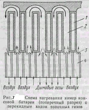 а рис. 7 показана схема нагревания шихты в камерах коксовой батареи (поперечный разрез) с перекидным над сводами камер ходом топочных газов. Воздух, поступающий на горение горючих газов, предварительно нагревается в регенераторах 4 и смешивается с газом, поступающим из отверстий 3 в простенках 2, расположенных между камерами /. В простенке 2 происходит сгорание газообразного топлива, и горячие дымовые газы огибают камеру, подогревают ее с другой стороны и уходят через регенераторы тепла в дымовую трубу.
