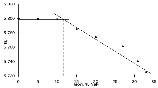 Рис. 11. Зависимости параметра кубической элементарной ячейки фазы Ф от анионного избытка